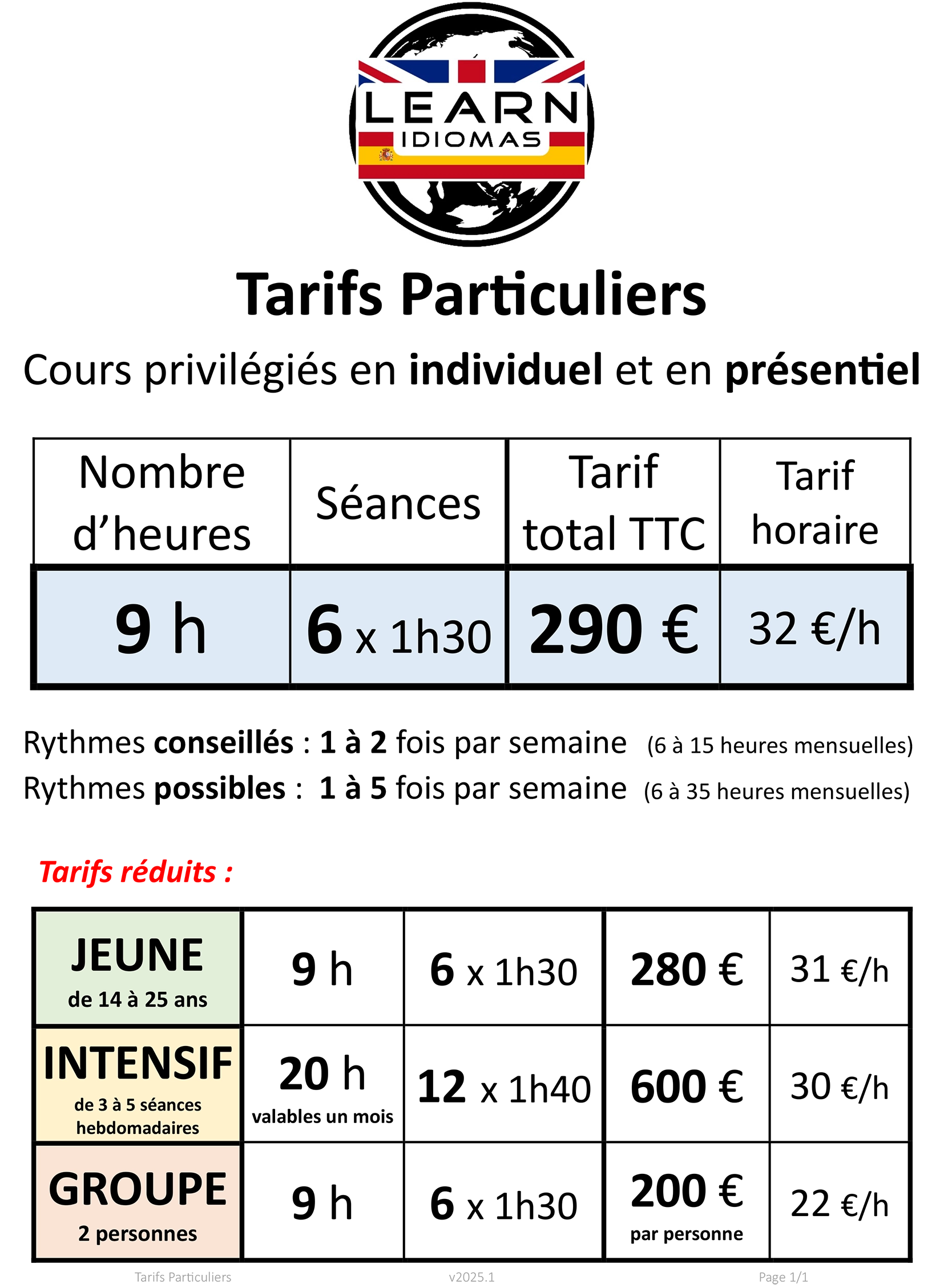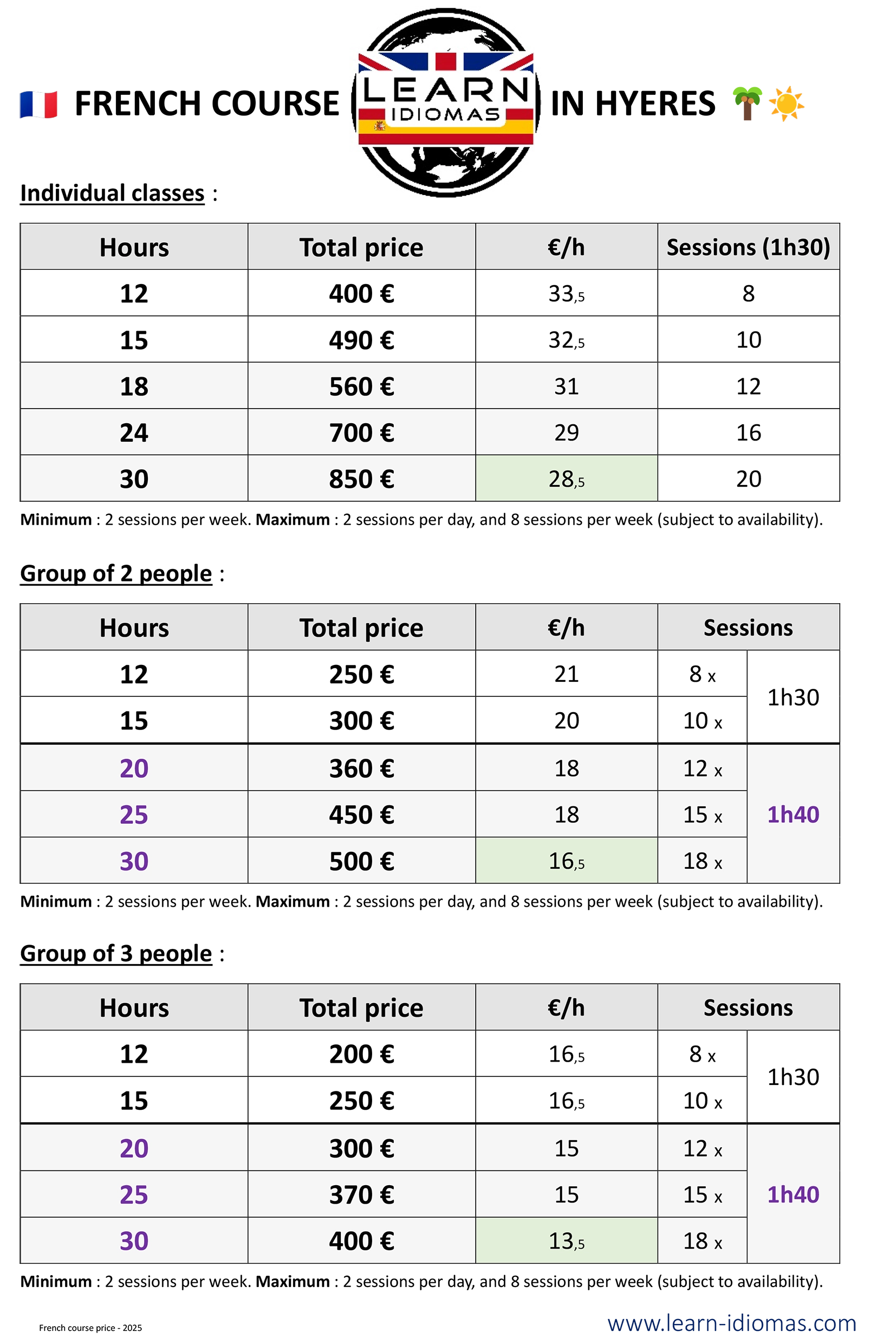 6 séances d’1h30, soit 9 heures de cours: 290€