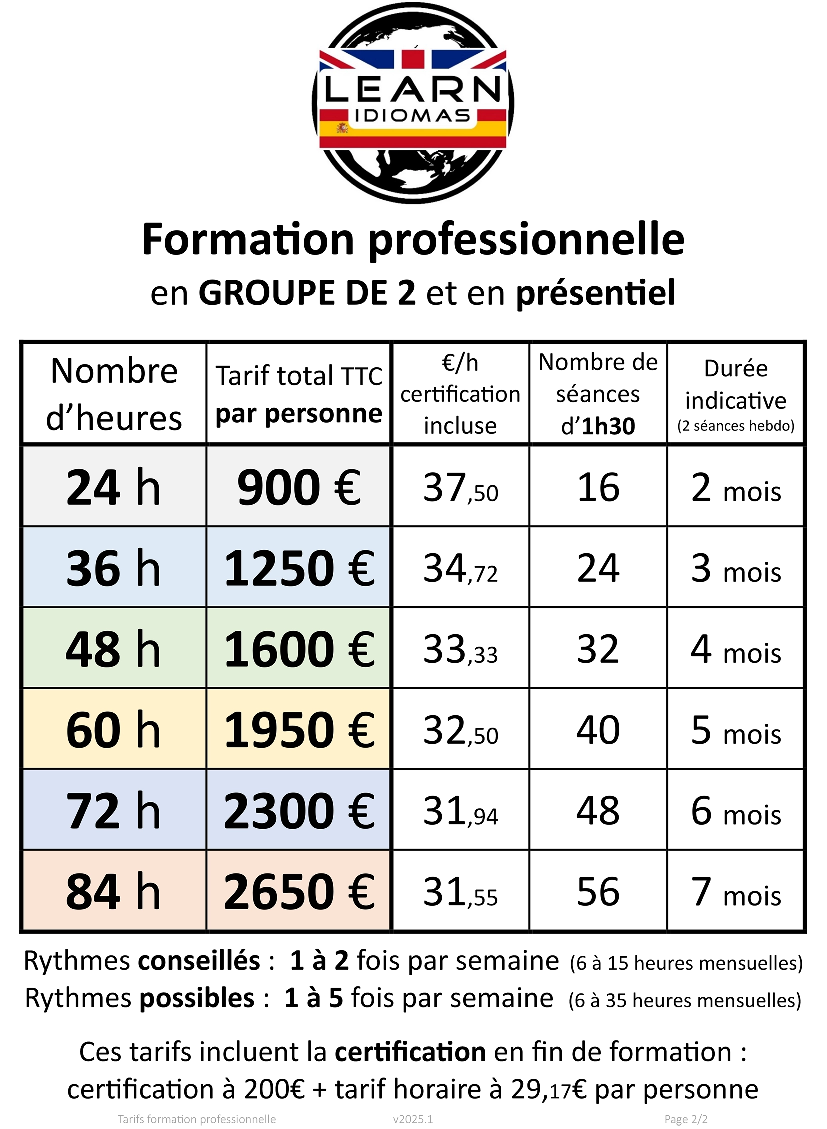 • De 24h à 84h, s’étalant jusqu’à 9 mois maximum. Une formation intensive est possible, jusqu’à 9 heures hebdomadaires selon disponibilités.