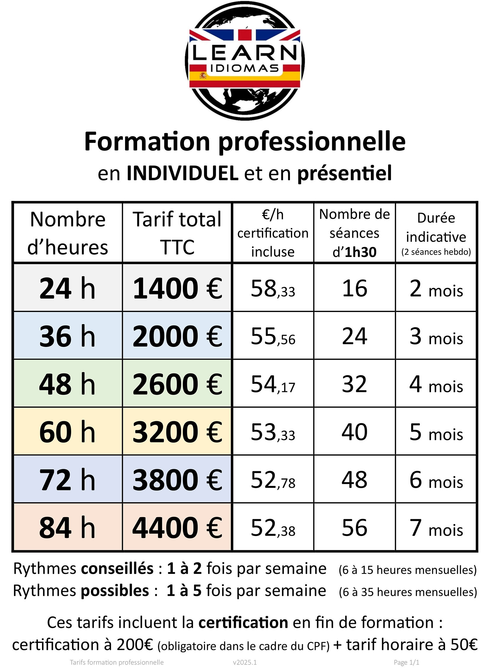 Un panel de 6 formations CPF est proposé par Learn idiomas :